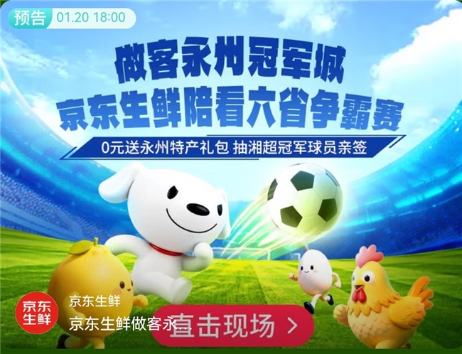 这个冬天,足球的热情点燃“湘超冠军”之城湖南永州。1月18日至24日,CMG群众足球邀请赛在永州举行,来自湖南永州、黑龙江哈尔滨、内蒙古呼和浩特、山东泰安、广东湛江、青海玉树的6支群众足球队齐聚九嶷山开启争霸之旅。为了让这项有“央超”之称的赛事更加深入群众,京东生鲜与永州市政府展开深度共建,联合打造“品永州美食 观绿茵对决”主题活动,对赛事进行全程直播,永州市副市长更是做客京东生鲜直播间,通过赛事直播与特色农产品推介,探索“体育+文旅+消费”融合发展的新模式,将这场体育竞技的盛会,演变为一场融合地方特色与消费创新的联农助农实践。